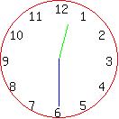 The hour hand is in between 3 and 4 and the minute hand at 6.
