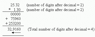 5. Starting from the right most digit for the product, count the total number of digits and place the decimal point.